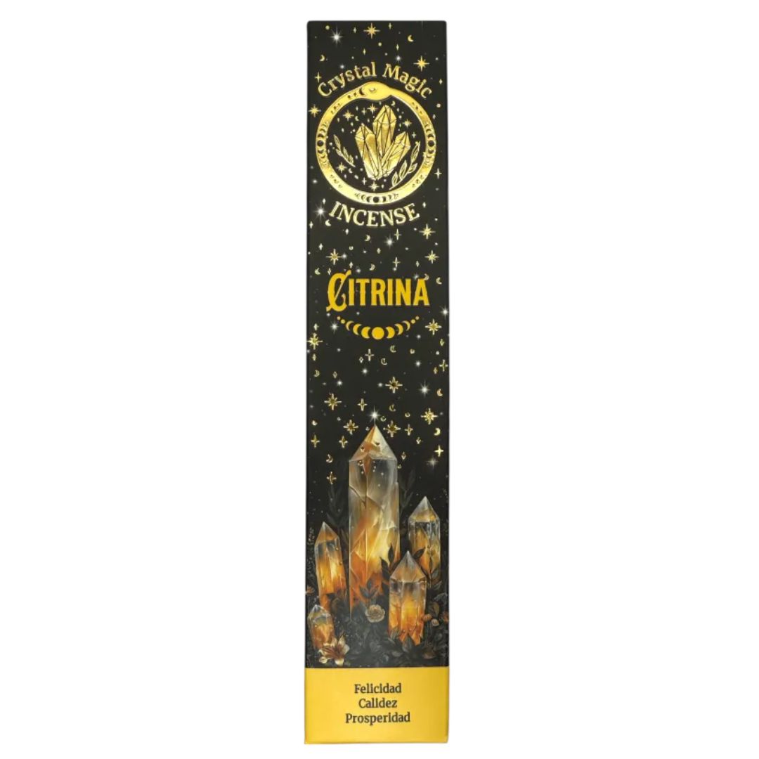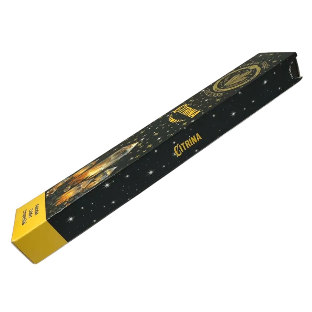 A bright, uplifting fragrance flows from each stick, carrying the golden radiance of Citrine. Known as the stone of joy and abundance, Citrine inspires positivity, prosperity, and inner confidence. Each pack includes a sachet of small Citrine minerals, which may be kept as amulets or placed upon your altar, extending the incense’s solar energy long after the smoke has faded.