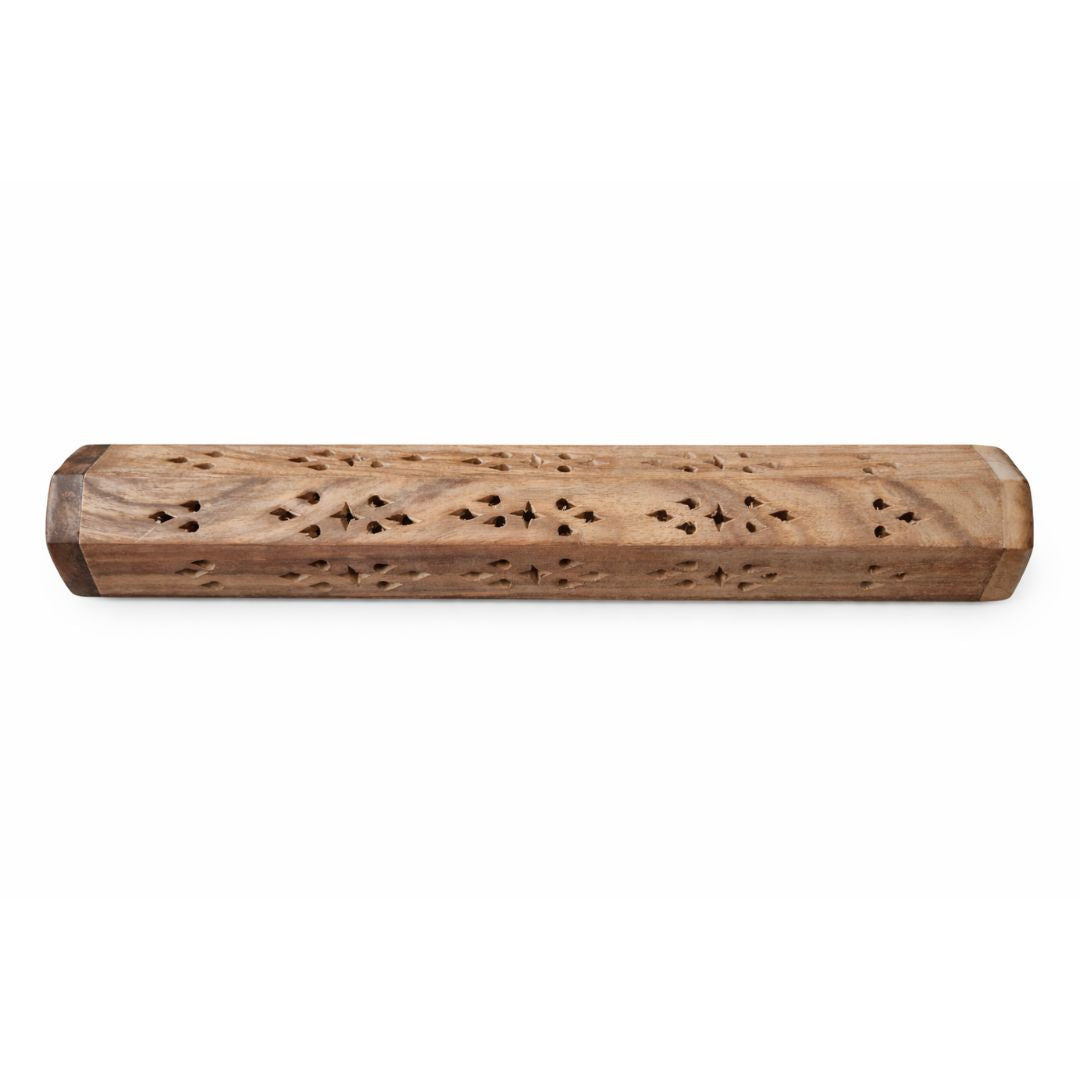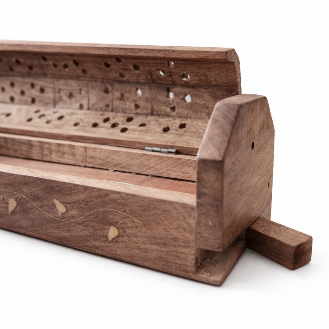 This natural wooden ash catcher box is crafted for those who prefer simplicity — warm wood grain, subtle carved detailing, and a design that keeps your incense ritual clean and contained.