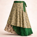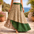 Vibrant yet grounded, the Emerald Horizon Silk Wrap Skirt brings together the richness of forest green with soft, sun-warmed neutrals. Layered panels reveal contrasting patterns beneath the surface, creating depth, movement, and a quietly confident presence.
