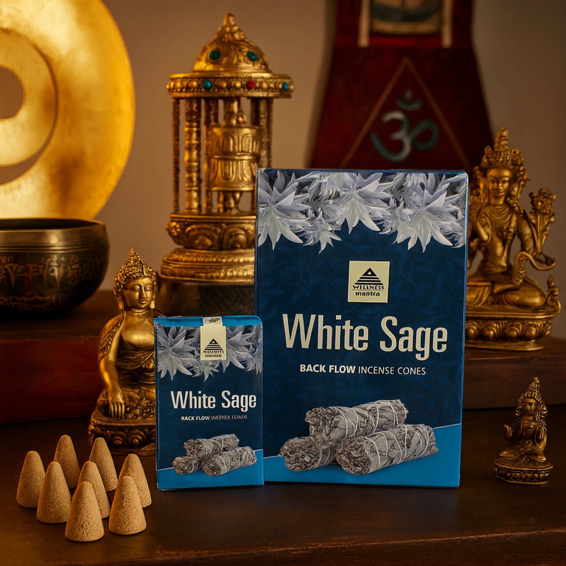 white sage incense cones, backflow incense South Africa, wellness mantra incense, sage smoke ritual, meditation fragrance, natural incense SA, Secret Sense incense, cleansing aroma, backflow burner cones, mindful ritual scent